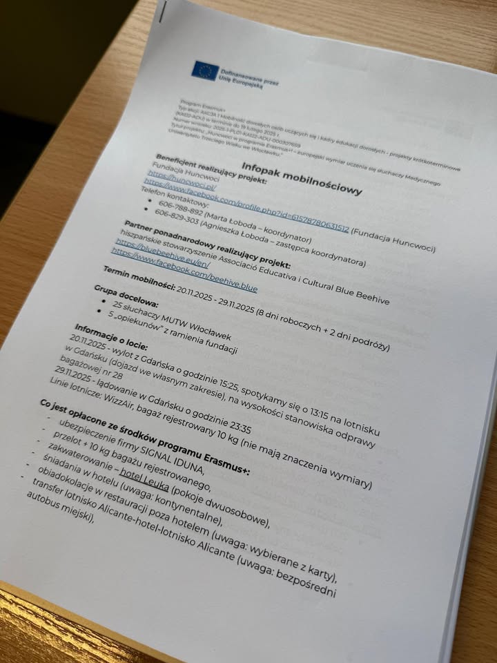 Już za parę dni, za dni parę ... Już wkrótce, bo 20 listopada, rozpocznie się niezwykle ważny etap projektu „Huncwoci w programie Erasmus+! – europejski wymiar uczenia się słuchaczy Medycznego Uniwersytetu Trzeciego Wieku we Włocławku”. Dwadzieścioro pięcioro naszych słuchaczy w wieku senioralnym wyruszy do Hiszpanii, by przez osiem dni rozwijać swoje kompetencje, zdobywać nowe doświadczenia i poznawać kulturę regionu Walencji. Do tego wyjątkowego wyjazdu słuchacze przygotowywali się już od lipca – uczestniczyli w zajęciach językowych, spotkaniach informacyjnych i warsztatach przybliżających realia Hiszpanii. Dziś wiedzą o regionie Walencji prawie wszystko – od historii i tradycji po codzienne zwyczaje mieszkańców. Pozostało tylko spakować walizki, powtórzyć hiszpańskie zwroty i z entuzjazmem wyruszyć w podróż pełną wiedzy, inspiracji i nowych przyjaźni. Mobilność edukacyjna realizowana będzie we współpracy z organizacją Associació Educativa i Cultural Blue Beehive, która przygotowała bogaty i różnorodny program. Każdy dzień wypełnią zajęcia rozwijające umiejętności, kompetencje i otwartość uczestników. W programie znalazły się m.in.: – codzienne godzinne rozgrzewki językowe w języku angielskim, które pomogą uczestnikom przełamać barierę komunikacyjną i nabrać pewności w kontaktach międzynarodowych, – dwugodzinne warsztaty dotyczące umiejętności uczenia się, obejmujące prezentację nowoczesnych aplikacji edukacyjnych, wykorzystanie sztucznej inteligencji w nauce oraz autorskie rozwiązania partnera przyjmującego, – dwugodzinne zajęcia rozwijające kompetencje obywatelskie, podczas których seniorzy zapoznają się z funkcjonowaniem Unii Europejskiej, prawami i obowiązkami obywateli, programami dedykowanymi osobom starszym oraz różnorodnością kulturową w Europie – wszystko w formie debat i dyskusji inspirowanych rzeczywistymi przykładami, – godzinne zajęcia z krytycznego myślenia i analizy informacji, uczące logicznego wnioskowania, rozpoznawania manipulacji i weryfikowania wiarygodności treści, – dwugodzinne aktywności kulturalne, podczas których uczestnicy wezmą udział w spotkaniach z hiszpańskimi seniorami, poznają ich sposób życia, wartości oraz lokalne tradycje. Wyjazd ten będzie nie tylko okazją do nauki, ale również do wymiany doświadczeń i odkrywania, że edukacja naprawdę nie ma wieku. Seniorzy z Włocławka staną się ambasadorami aktywności, otwartości i współpracy międzypokoleniowej, a zdobyte doświadczenia z pewnością zaowocują po powrocie – w działaniach lokalnych, nowych inicjatywach i osobistym rozwoju każdego uczestnika.