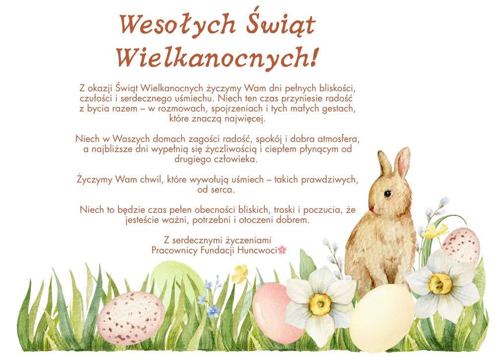 z okazji Świąt Wielkanocnych życzymy Wam dni pełnych bliskości, czułości i serdecznego uśmiechu. Niech ten czas przyniesie radość z bycia razem – w rozmowach, spojrzeniach i tych małych gestach, które znaczą najwięcej.