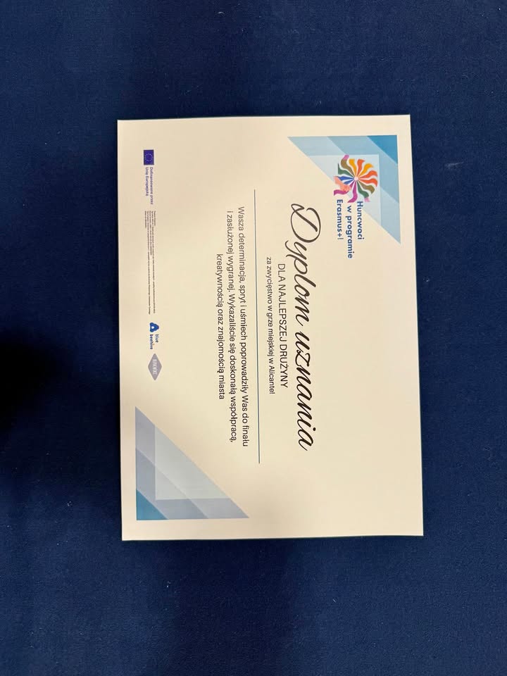 Siódmego dnia mobilności poznaliśmy zwycięską drużynę naszej gry miejskiej w Alicante! Po emocjonujących zmaganiach, dwunastu zadaniach i wielu kilometrach w nogach tytuł najlepszej ekipy trafił do drużyny, która połączyła wiedzę, refleks i świetną współpracę. Gratulujemy wszystkim uczestnikom – każdy zespół pokazał ogromne zaangażowanie, kreatywność i ducha przygody!